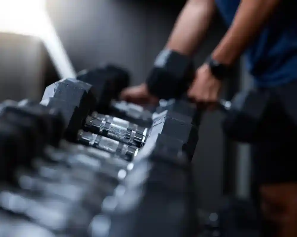 Two individuals are engaged in a weightlifting session, one holding a shiny metal dumbbell weighing 10 kilograms. The focus is on their hands gripping the weights. A rack of various weights, including dumbbells, stands against a brick wall, with treadmills visible in the background of a gym.