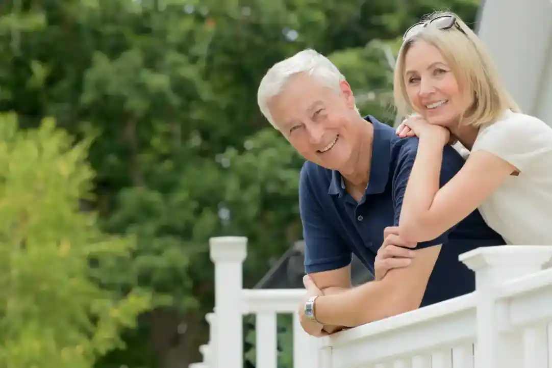 A smiling couple stands close together outdoors, with the woman leaning affectionately on the mans shoulder. They are in front of a modern static holiday home surrounded by greenery.