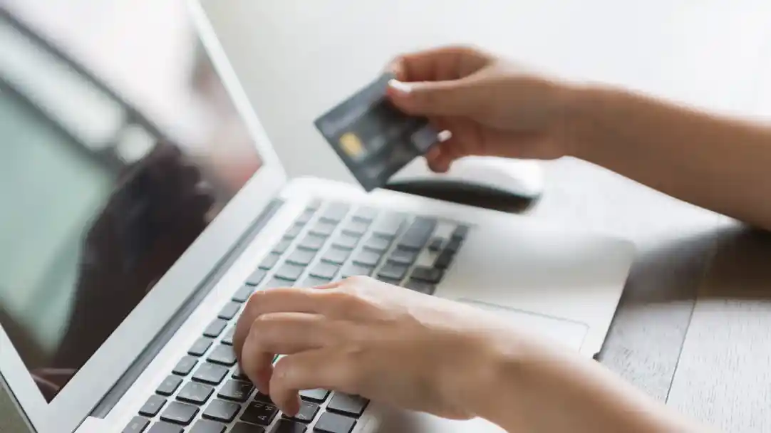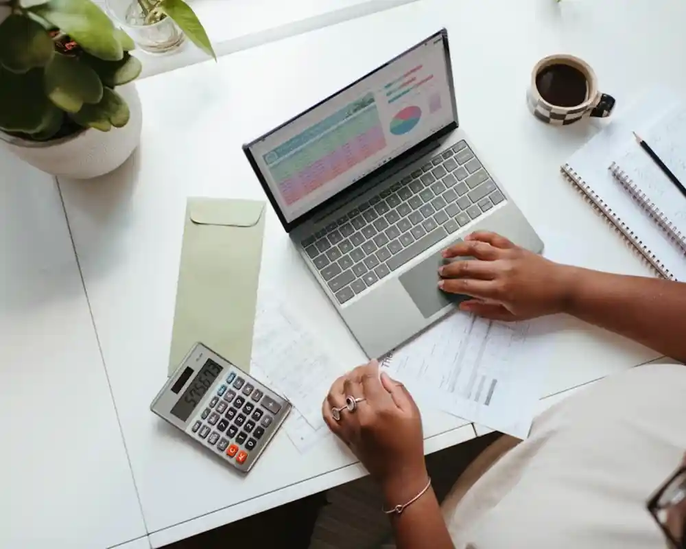 A person's hand typing on a laptop keyboard while holding a smartphone in the other hand. The scene is illuminated with soft light, creating a modern, dynamic atmosphere.